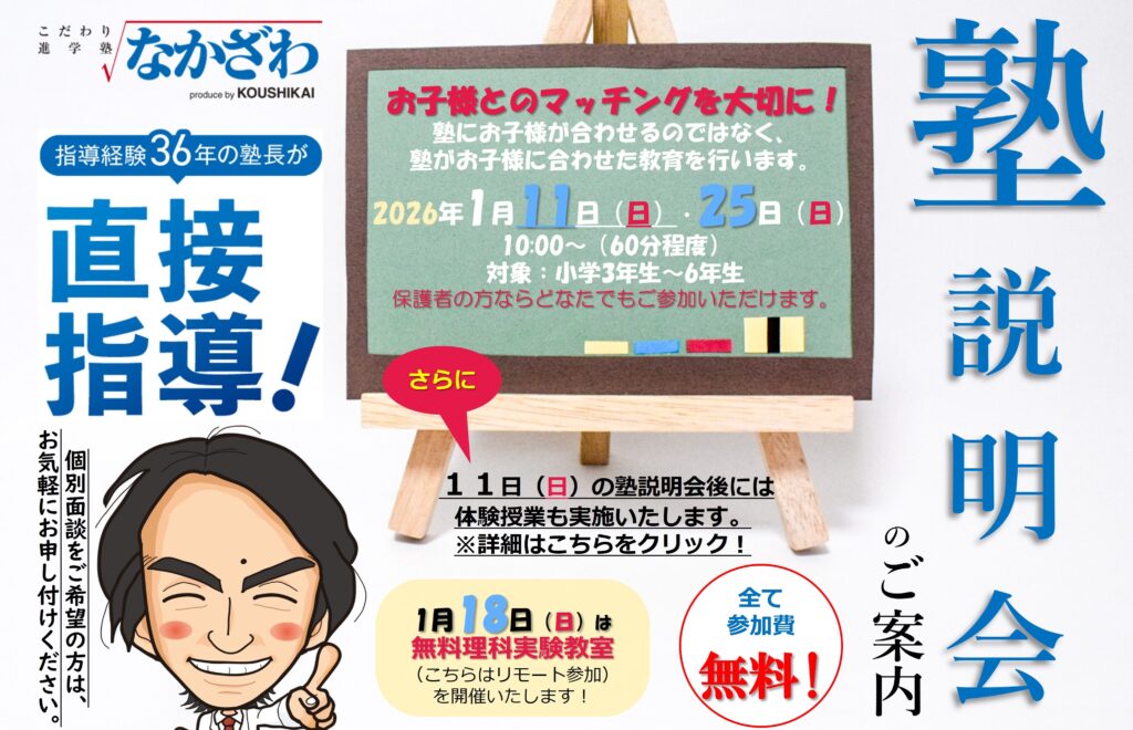 小学生のための中学受験塾「こだわり進学塾なかざわ」の塾説明会は、新年1月も元気に実施いたします。