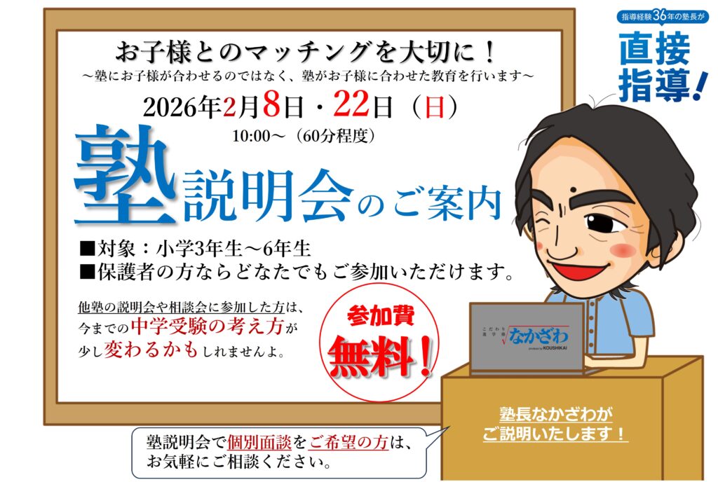 小学生のための中学受験塾「こだわり進学塾なかざわ」の塾説明会は、2月も元気に実施いたします。