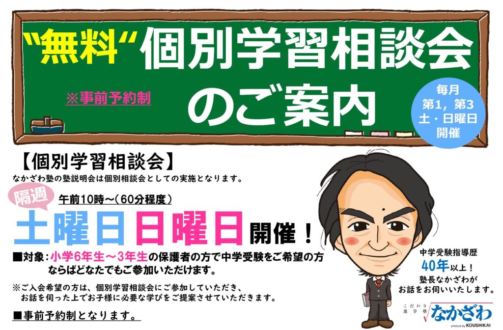 中学受験 “無料” 個別学習相談会のご案内 nakazawa_kanri 2か月前 なかざわ塾の塾説明会は個別相談会としての実施となります。 『個別学習相談会』概要▼内 容 “ 中立的な立場でのアドバイス、お子様・ご家庭のお考えに合ったご提案を心がけております。” ・お子様にあった中学受験学習の進め方 ・進学後に伸びる!我が子が目指すべき学校とは ・受験学習でのご家庭での役割とは ・通っている塾での学習上の注意点は ▼対 象 小学6年生~4年生の保護者の方で中学受験をご希望の方ならばどなたでもご参加いただけます。 ▼お申込み 完全予約制となっております。HPまたはお電話にてお申込みください。詳細は下記バナーをクリック!今月の日程および、詳細はコチラ! SNSで共有する Facebook で共有 (新しいウィンドウで開きます) Facebook X で共有 (新しいウィンドウで開きます) X 友達にメールでリンクを送信 (新しいウィンドウで開きます) メールアドレス 5月|中学受験 “無料” 個別学習相談会のご案内日付2026年4月20日関連理由お知らせ【11月度】中学受験に強い学習塾「なかざわ塾 個別学習相談会」のご案内日付2022年10月18日関連理由お知らせ【2026.2月】中学受験に強い学習塾「個別相談会」のご案内日付2026年1月26日関連理由お知らせ